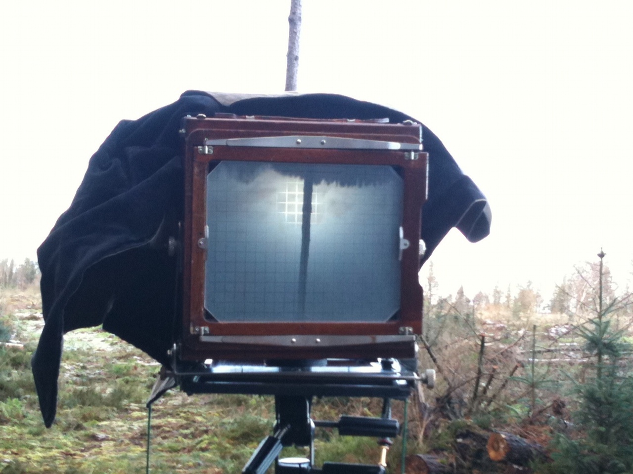 Each 8×10 negative is made with my Deardorff. The image making light is projected onto the ground glass screen of the camera. Composition and focusing are aided by the use of the dark cloth which can be seen resting on the top of the camera in this picture.