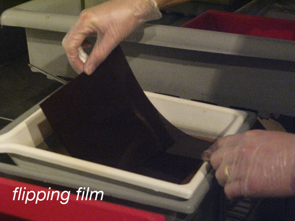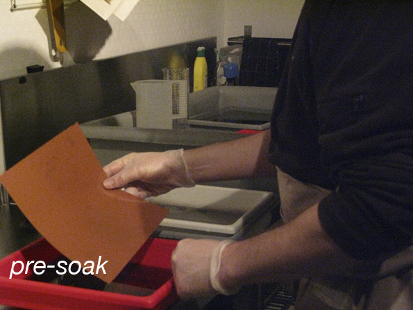 The film is removed from its dark slide and placed in the pre-soak dish for 2 minutes. The pre-soak is water with wetting agent added. This allows the silver gelatin emulsion to swell slightly and reduces surface tension of the water.