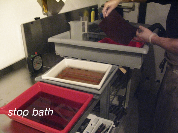 When development is complete the film is transferred to the stop bath, which is a dilute solution of acitic acid that immediately halts the development of silver salts.